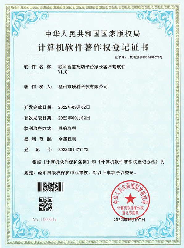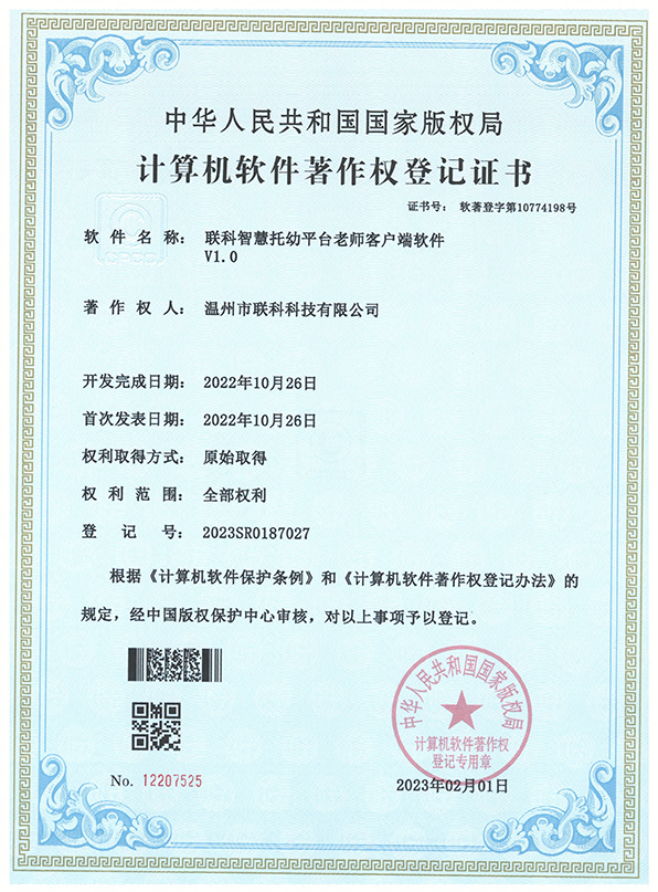 聯科智慧托幼平臺老師客戶端軟件V1.0登記證書(2022R11L2332140)