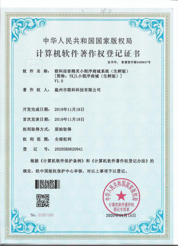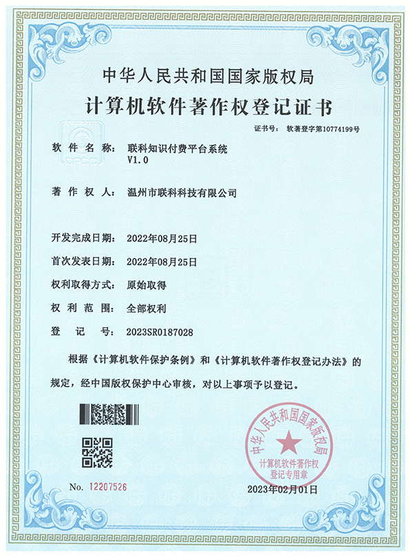 聯科知識付費平臺系統V1.0登記證書(2022R11L2324406)