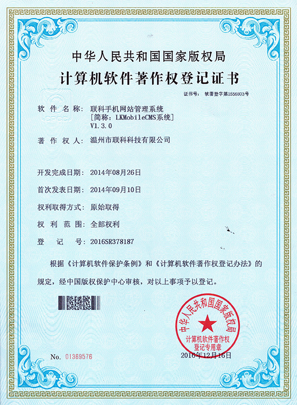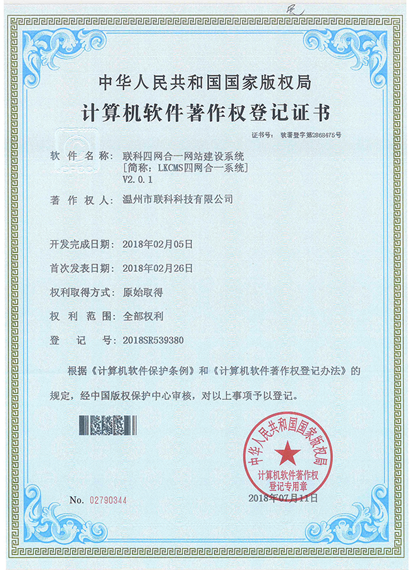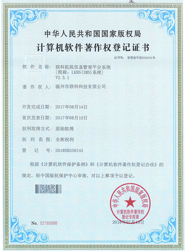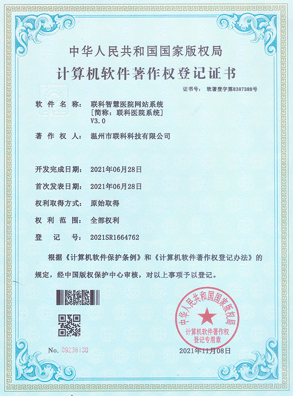 聯科醫院網站集約化管理平臺V1.0登記證書(2022R11L2489282)