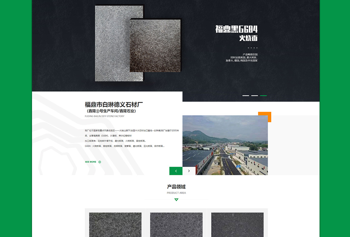 我廠位于國家級重點風景名勝區——太姥山腳下(全國十大石材出口基地--白琳鎮)我廠始建于2005年底,主營福鼎黑(G684)、沙漠棕、壽寧紅等板材加工版面有:花崗巖外墻干掛、磨光板面、火燒板面、荔枝板面。G684:火燒板面、荔枝板面、龍眼板面、菠蘿面、磨光板面、亞光板面、自然板面...
