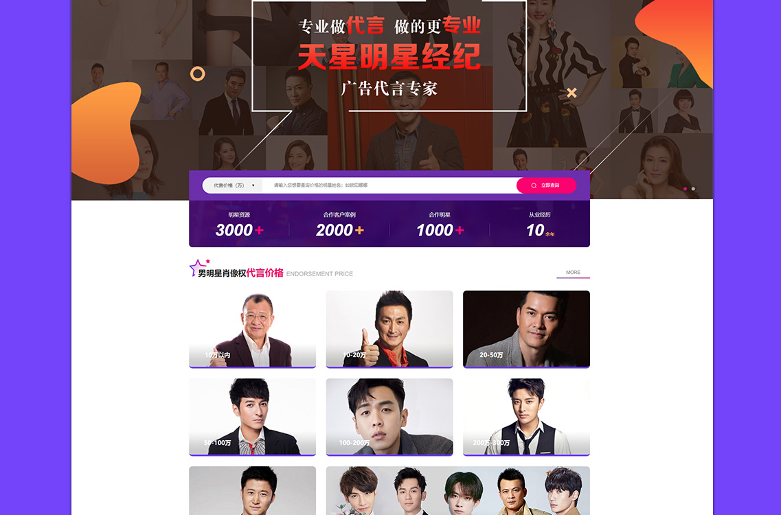 天星明星經紀,是一家為企業請明星做代言、明星經紀代理、活動嘉賓演出、平面及影視廣告拍攝制作于一體的專業性娛樂傳媒機構。經過多年的努力, 公司憑借著多年豐富的從業經驗和具有專業操作模式的團隊,通過深入有效的溝通,為企業和明星藝人搭建起良好的合作平臺。