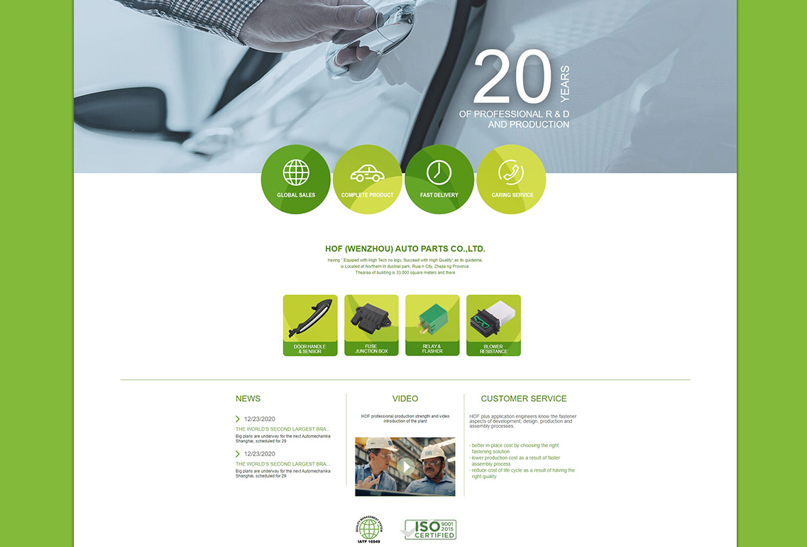 霍富(溫州)汽車配件有限公司位于浙江省瑞安市北方工業園區,以“裝備高科技,成功成功”為準則。 建筑面積為33,000平方米,有200名工人。 我們在無鑰匙門把手,箱體中心,繼電器和閃光燈,加熱器鼓風機電阻器,ECD單元,前燈控制單元等領域擁有15年的專業產品汽配經驗