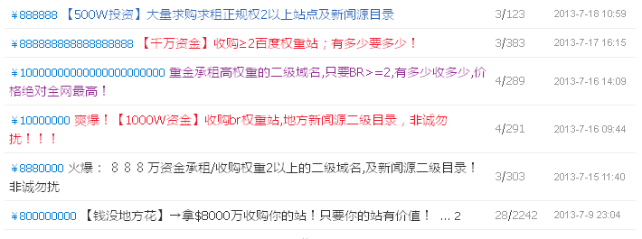 2013年7月19日百度網頁搜索反作弊團隊對于一些論壇出現大量的高價收購二級域名或目錄的信息,絕大部分被用于作弊,例如:太原新聞網,出售二級目錄被用于作弊。對于此類出售二級域名二級目錄的問題,將進行嚴厲的懲罰,株連至整個站點,直接屏蔽并清理出百度新聞源。