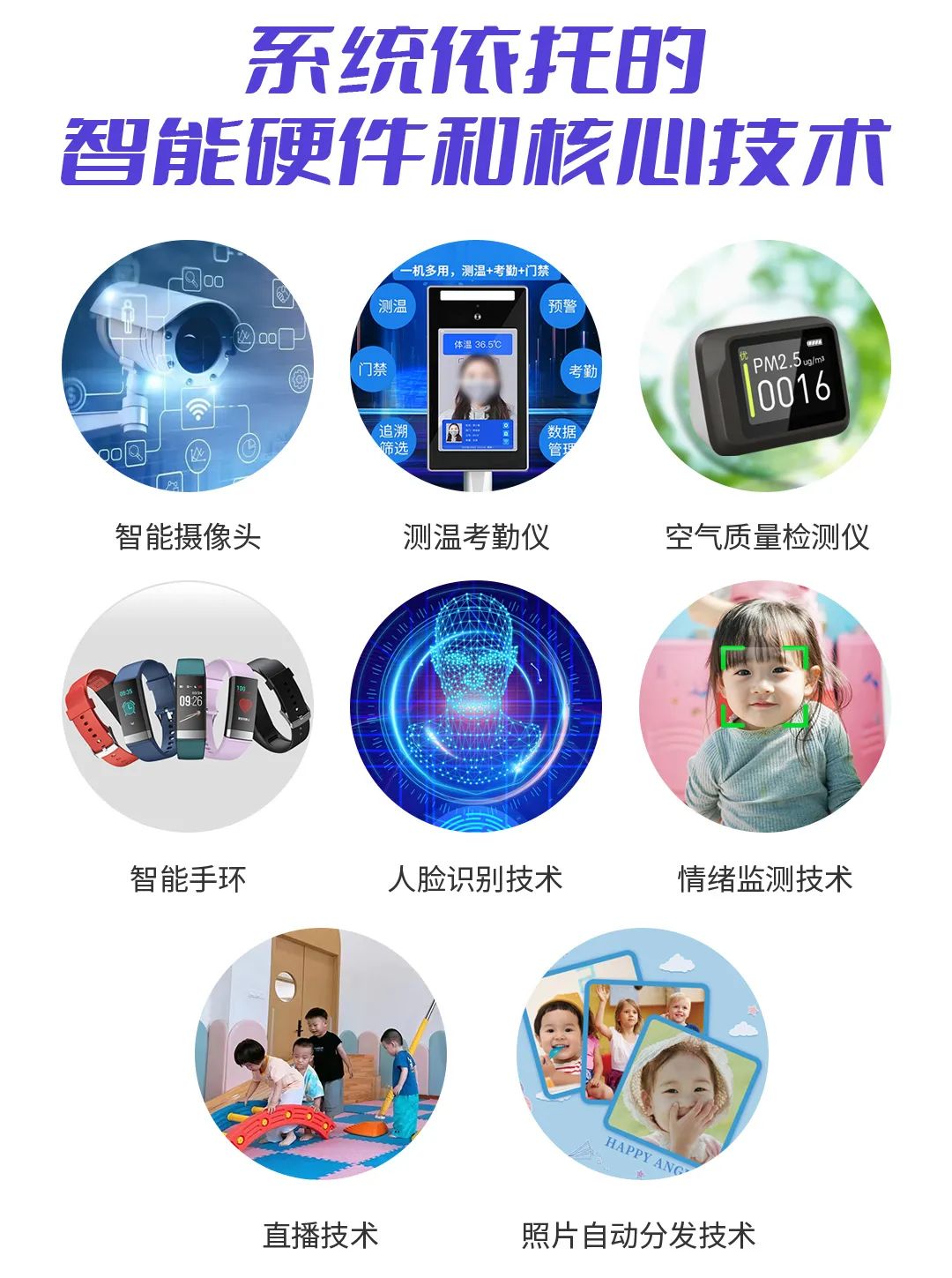 本系統充分利用互聯網、大數據、物聯網、人工智能、智能硬件等技術,將智能硬件設備與多元化軟件模塊深度結合,既為托育園、幼兒園各項管理工作提供便捷的工具輔助,又實現了數據的伴隨式采集和實時應用。系統結合嬰幼兒照護服務實際,提升園所保教服務質量和安全保障,基于園所數字化運營需要,實現園務管理、家園共育、教學管理、營銷招生、智慧監管、衛生保健、臺賬管理等功能。