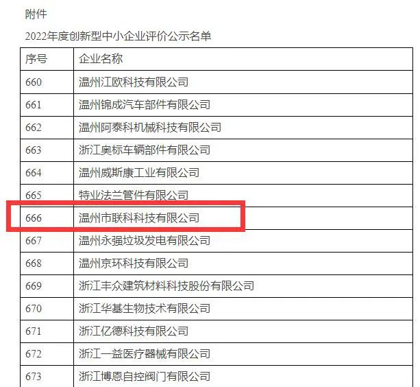 根據溫州市經濟和信息化局于2022年12月19日發布的《溫州市2022年度創新型中小企業評價結果公示》顯示,溫州市聯科科技有限公司成功入選2022年度溫州市創新型中小企業名單。