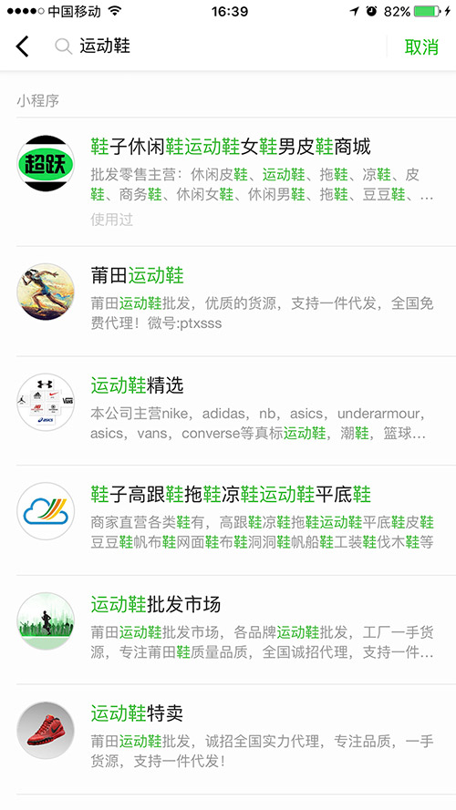 比如上面的圖片中,小程序中搜索關鍵詞“運動鞋”,就出現很多相關的關鍵詞,如男鞋、女鞋、涼鞋、皮鞋、商務鞋等這些用戶使用頻率高的產品關鍵詞,當用戶去搜索男鞋、女鞋這些詞的時候這個小程序依然會有展現的概率。