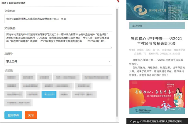 在醫(yī)院內(nèi)容管理系統(tǒng)基礎(chǔ)上開發(fā)一套接入企業(yè)微信的系統(tǒng)。能夠?qū)?nèi)容管理系統(tǒng)中的文章推送到企業(yè)微信指定的應(yīng)用號(hào)中。可選不同應(yīng)用,不同用戶標(biāo)簽做到信息資源的定向推送。擁有審核機(jī)制,普通用戶申請(qǐng)推送,管理員審核通過后發(fā)起企業(yè)微信消息推送。極大改善了普通信息資源發(fā)布后用戶被動(dòng)閱讀的弊端。