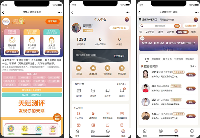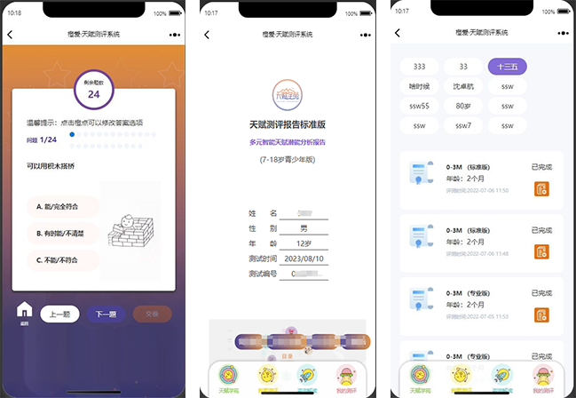 橙愛測評系統(tǒng)用到的八大智能數(shù)據(jù)、測評試卷、測評題目、測評結(jié)果數(shù)據(jù)、測評報告數(shù)據(jù)、測評報告訂單、訪問日志、報告解鎖碼和預(yù)約用戶等內(nèi)容進行管理。系統(tǒng)支持多用戶多年齡段的測評,根據(jù)用戶端測試結(jié)果進行數(shù)據(jù)處理,從而形成測評對象的專業(yè)測評報告,傳輸給前端用戶查閱。